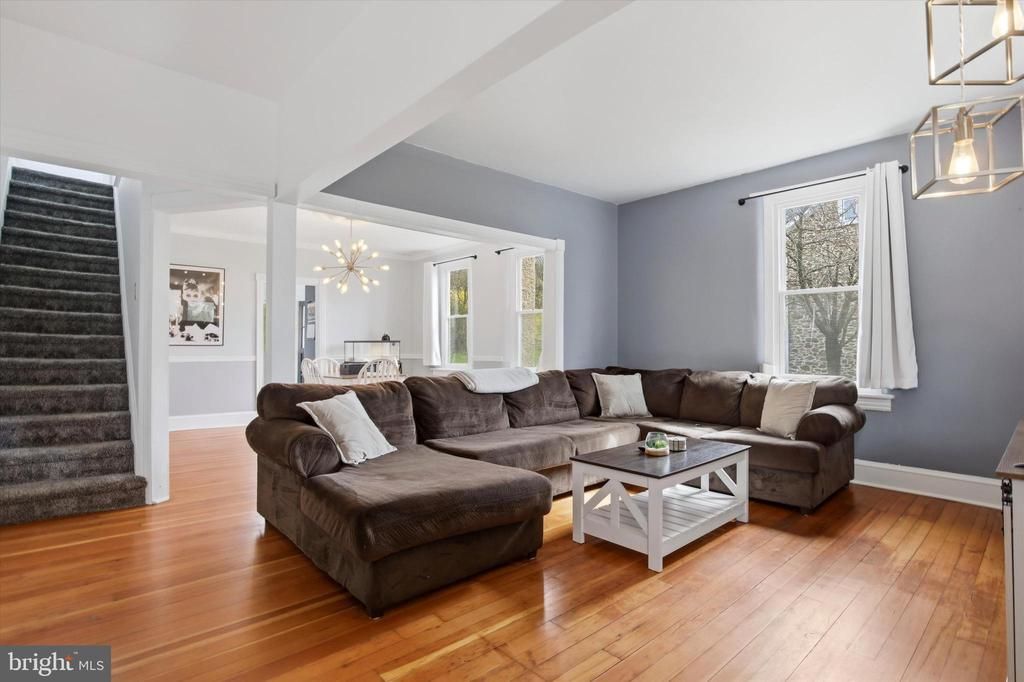 Now for sale in Green Lane! This 4 bedroom, 1.5 bathroom home sits on a half-acre lot and includes a detached oversized 3-car garage plus lots of driveway parking. As you enter from the covered front porch, you'll be greeted by the open living/dining area with hardwood flooring. There's plentiful seating area and the dining room includes crown molding, chair rail, and decorative ceiling coin with modern chandelier lighting. The roomy kitchen includes lots of cabinetry and shelving, oversized sink, tile flooring, and room for a table or island. Here, there's also access to the laundry closet, powder room, and door to the patio for lounging or dining al fresco. Head upstairs to find 3 carpeted bedrooms and full bath with tub shower and deck access. The top floor finished attic provides additional usable space for a 4th bedroom, office, sitting area - owner's choice! This home has no shortage of parking, including a large detached garage with 3 doors. Use it for covered parking or make it into a work studio or entertaining space. You also have your own small private parking lot with room for 8+ cars! If you're looking for a new home in the area, be sure to add this one to your list!